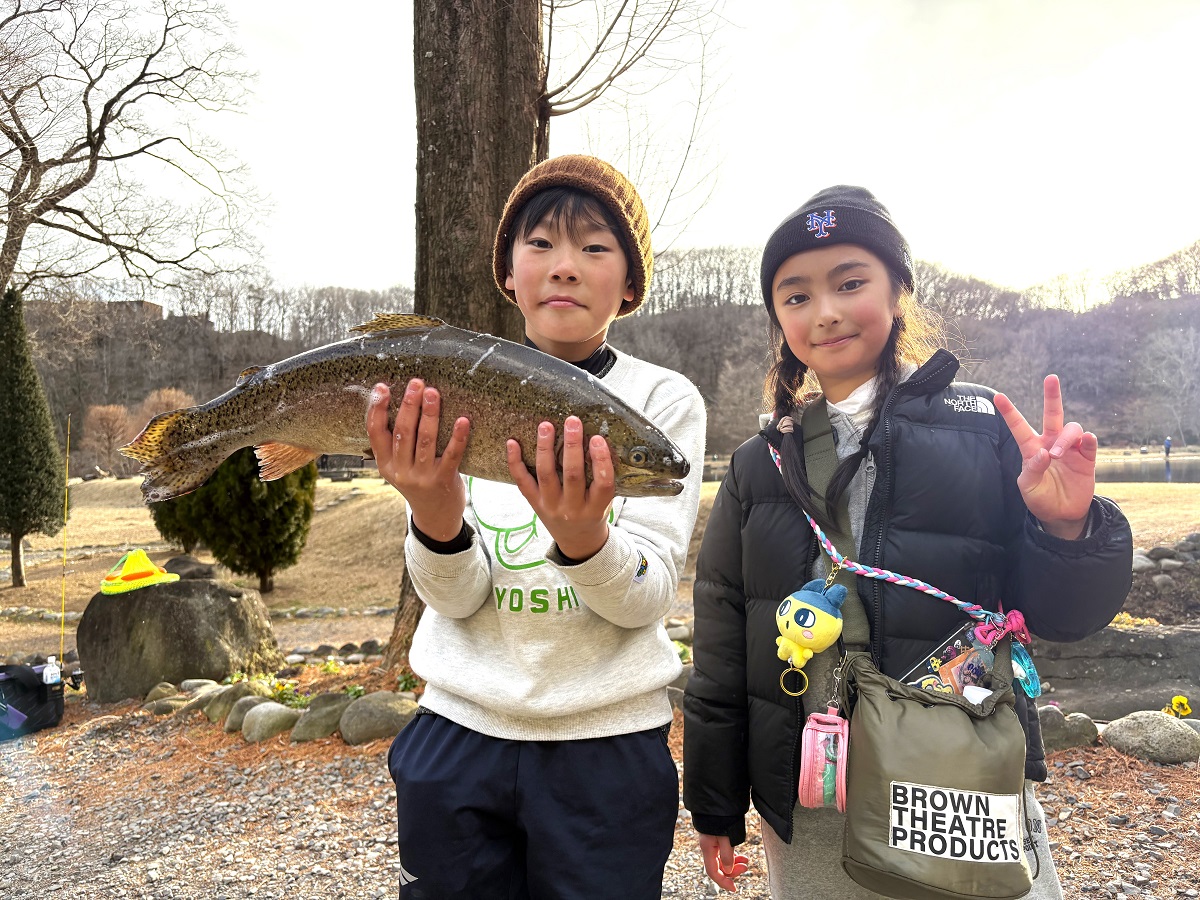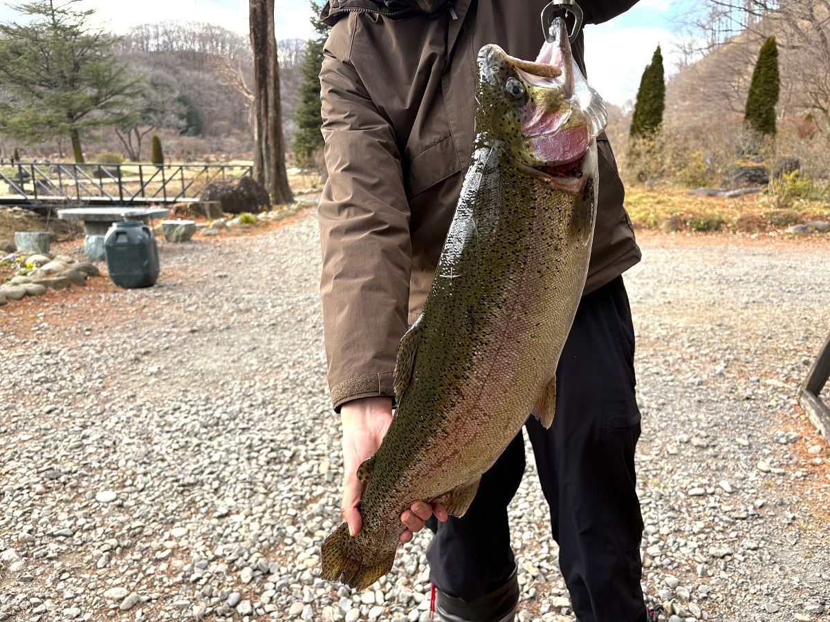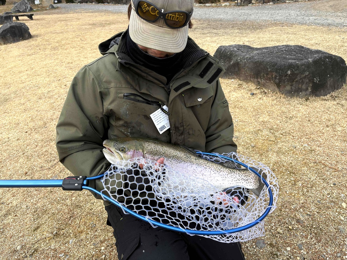 たまたま通りかかったら、大型のレインボーとファイトしている青年がいたので、写真を撮らせて頂きました。まあ走ること走ること!ものすごいアタリだったみたいです。現在、那須白河FSでは、あちこちでこのような良型が釣れています。楽しいお年玉ですね♪