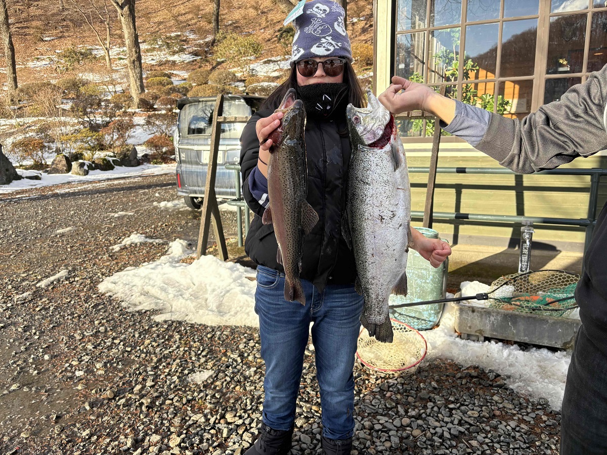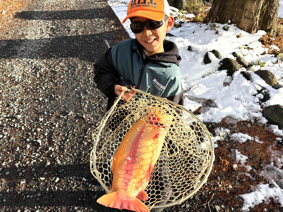 那須町からお越しの小学生アングラー。見事、大型のアルビノをチャッチ!ヒットルアーは、NOA。カラーはピンクだったそうです。足元の悪い中、頑張って良かったですね。
